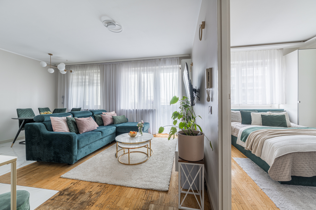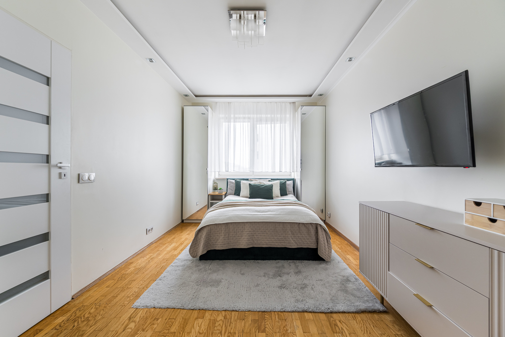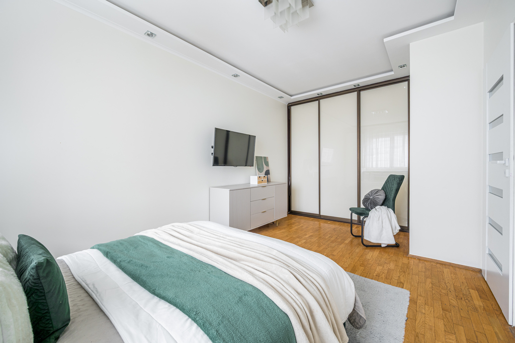 Mieszkanie składa się z salonu z aneksem kuchennym, przestronnej sypialni, przedpokoju i łazienki. Do lokalu przynależy duży balkon. Ekspozycja mieszkania na stronę zachodnią.