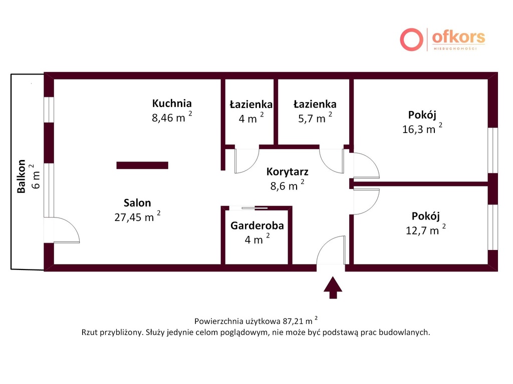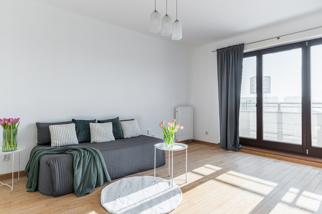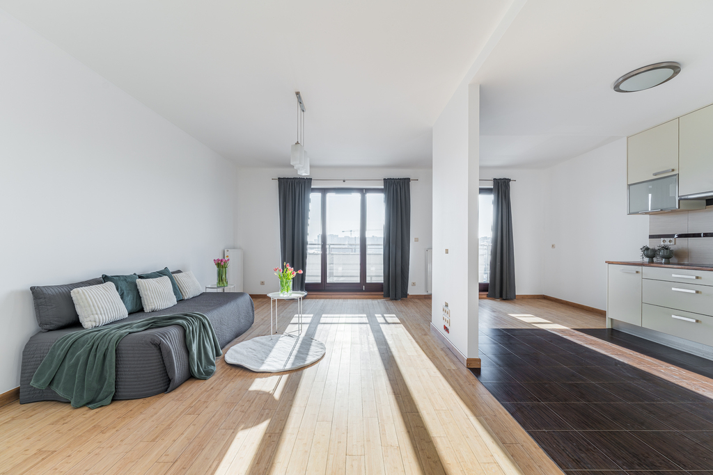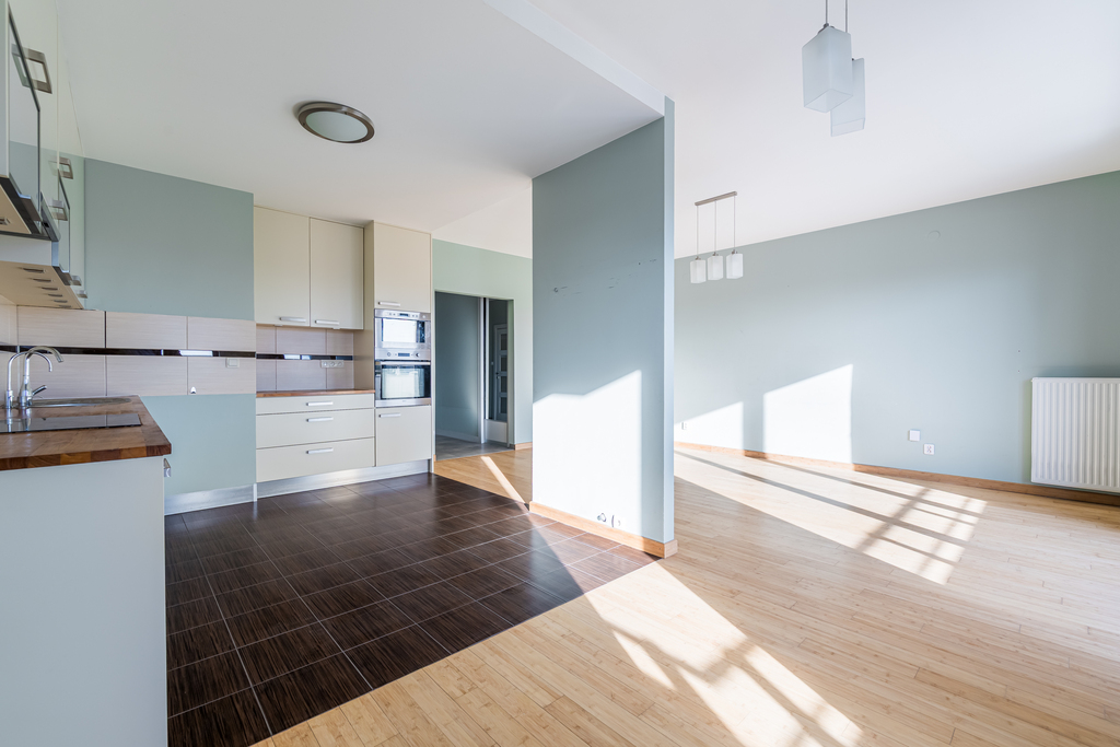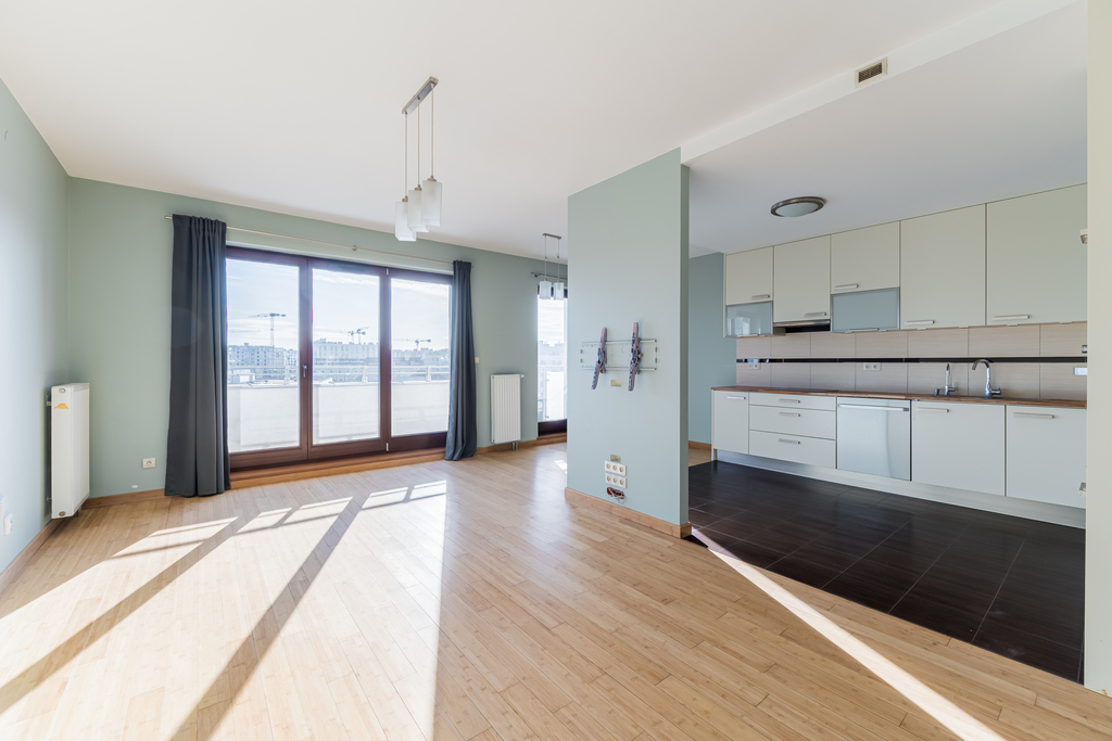 Powierzchnia mieszkania wynosi 87 metrów kw. i składa się z 3 odrębnych pokoi z możliwością wyodrębnienia 4. Układ pomieszczeń składa się z części dziennej złożonej z wygodnej, otwartej kuchni (ok. 8,5 m kw) i przestronnego, słonecznego salonu (ok. 27,5 m kw.) z wyjściem na duży balkon. Kuchnia wyposażona jest w meble w zabudowie oraz zmywarkę, płytę indukcyjną, okap, piekarnik elektryczny oraz mikrofalówkę.