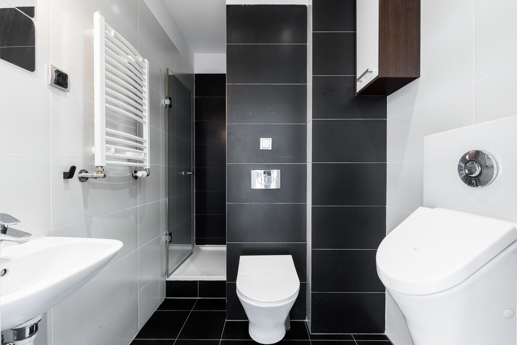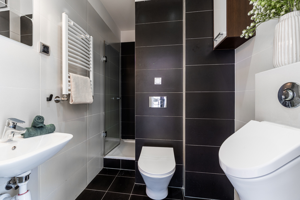 Druga część mieszkania składa się z dwóch pokojów o powierzchni ok, 16 i 13 m kw. oraz dwóch doskonale wyposażonych łazienek. W pierwszej z nich znajduje się kabina prysznicowa, umywalka, toaleta i pisuar, w drugiej natomiast wygodna wanna dla wielbicieli kąpieli oraz umywalka i toaleta.