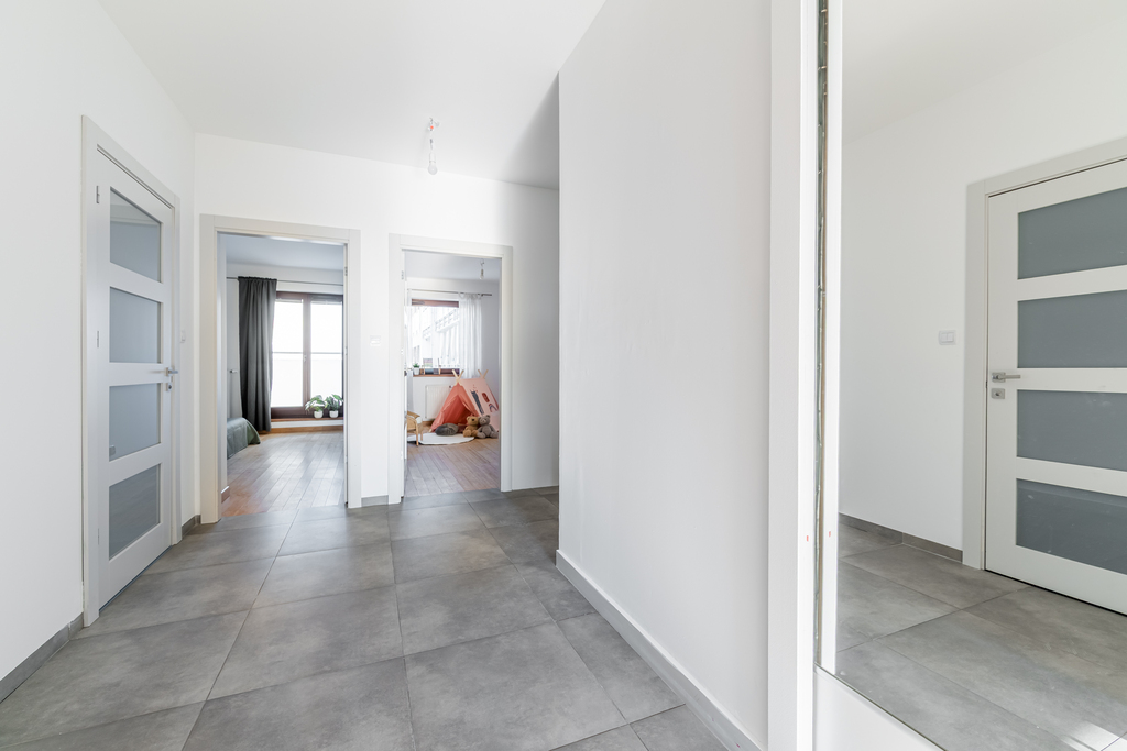 Na korytarzu znajdziemy pomieszczenie o powierzchni 4 m kw., oddzielone od reszty przedpokoju drzwiami przesuwnymi, spełniające rolę garderoby i schowka.