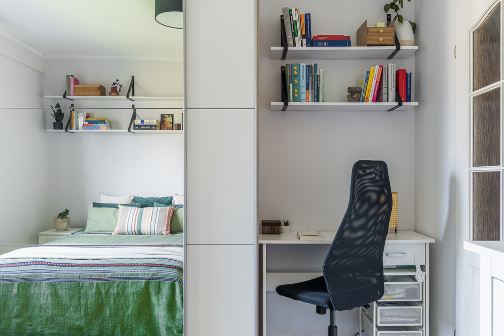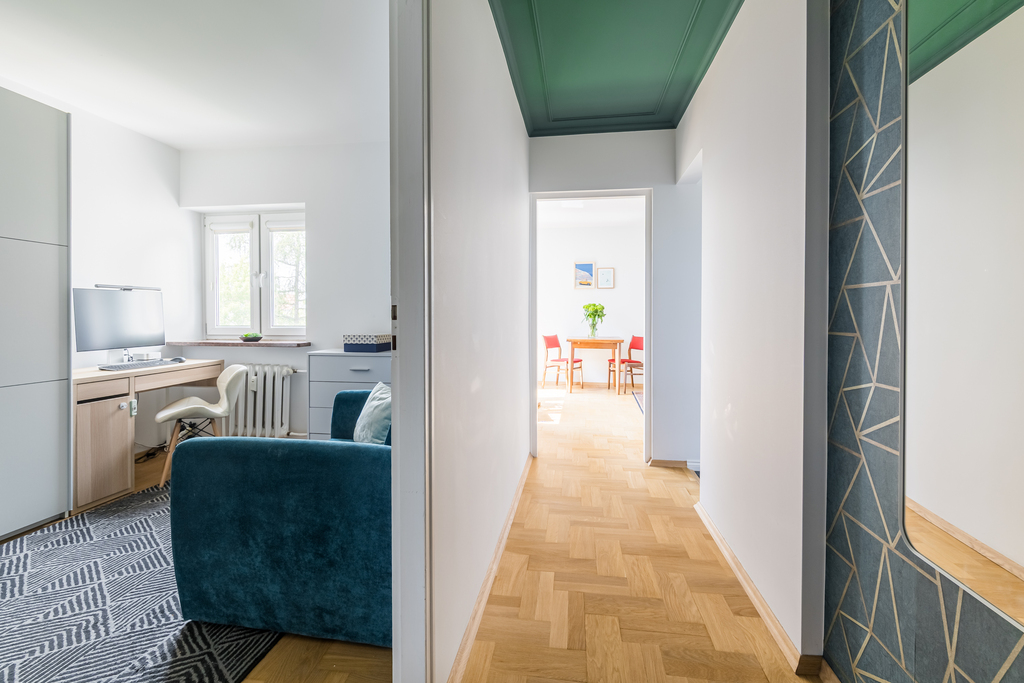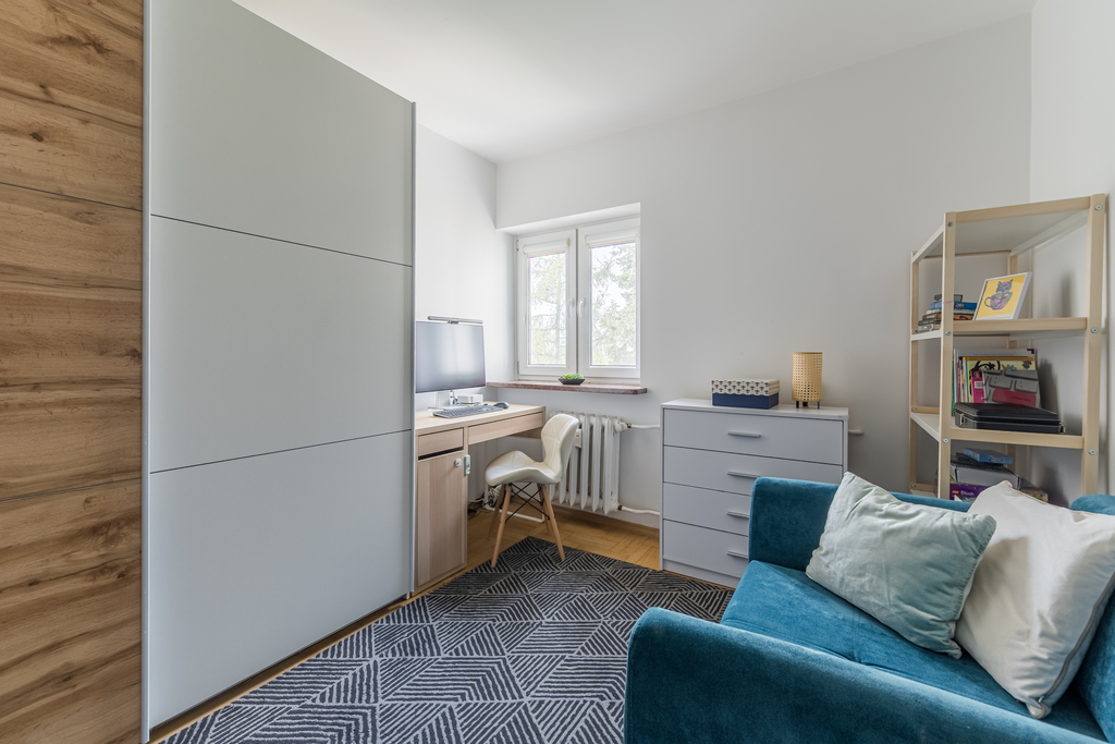 Największy pokój z balkonem, pełniący rolę salonu, liczy 18 m kw. To przestrzeń, która doskonale sprawdza się jako serce domu i jest idealnym miejscem na relaks. Tuż obok znajduje się doskonale wyposażona kuchnia, a na wprost niej - pokój pełniący obecnie funkcję gabinetu. Sypialnia, położona w pewnym oddaleniu od pozostałych pomieszczeń, zapewnia idealne warunki do odpoczynku. Znalazło się w niej również miejsce na biurko i pojemną szafę.