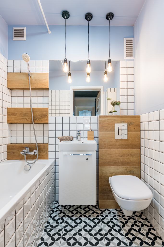 Łazienka jest dość kompaktowa, wyposażona w wannę, toaletę i umywalkę.