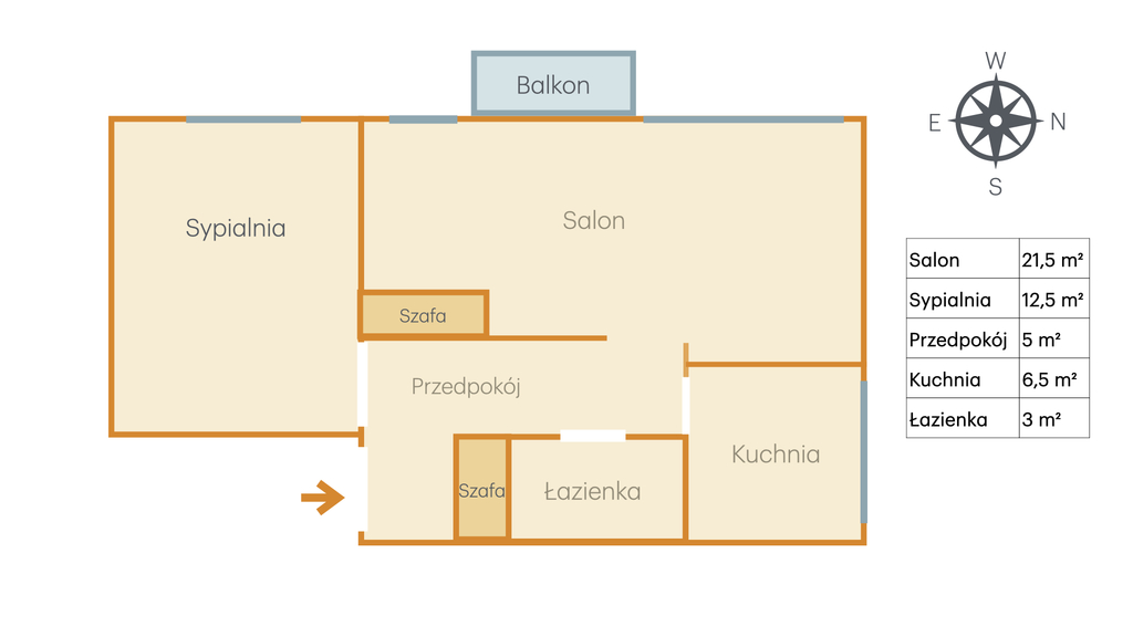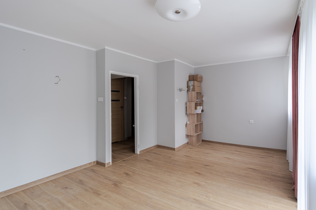 Tuż za progiem znajdujemy się w przestronnym przedpokoju (wyposażonym w dwie pojemne szafy), z którego to mamy dostęp do wszystkich pomieszczeń. Mniejszy pokój (12,5m²) obecnie pełni funkcję sypialni wyposażonej w dwie szafy. Salon z dostępem do balkonu mierzy blisko 22m². To metraż, który doskonale sprawdza się jako pokój dzienny.