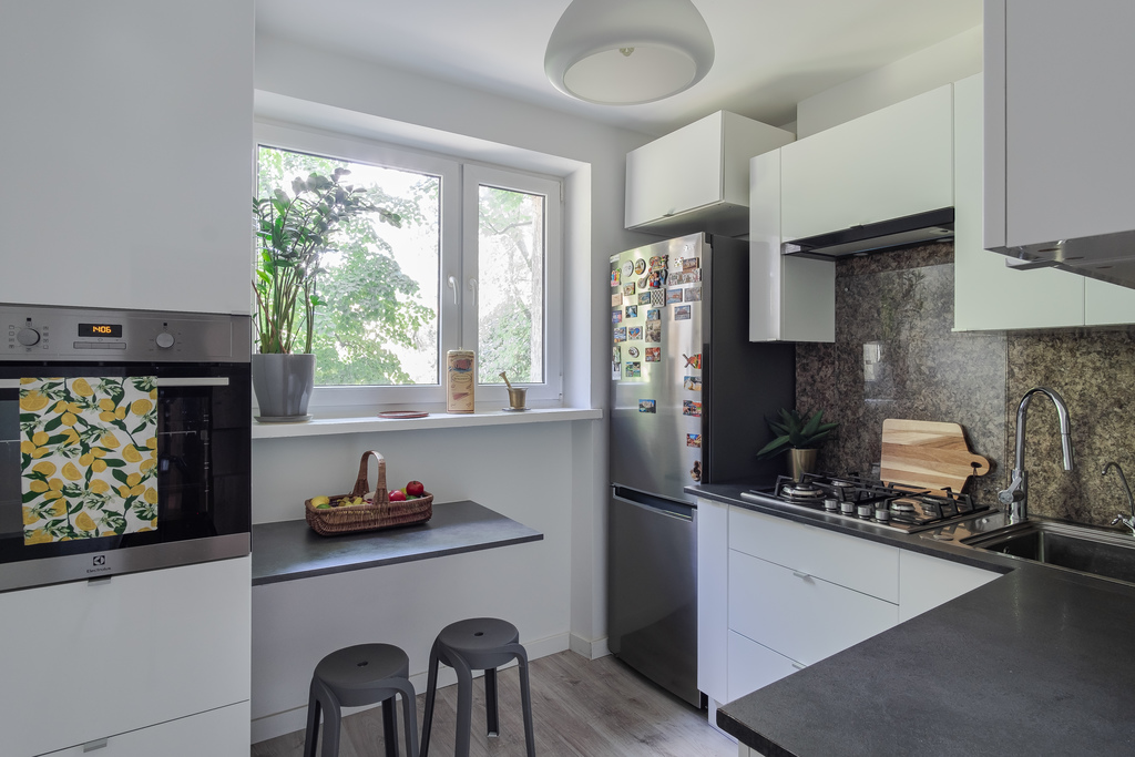 Kuchnia (6,5m²) posiada wszystkie niezbędne sprzęty, jest widna i przestronna. Toaleta (3m²) została wyposażona w prysznic i pomimo kompaktowego rozmiaru, jest w niej miejsce na wszystko co niezbędne.