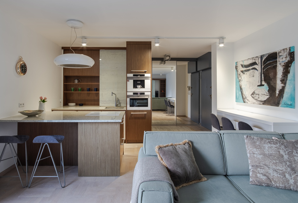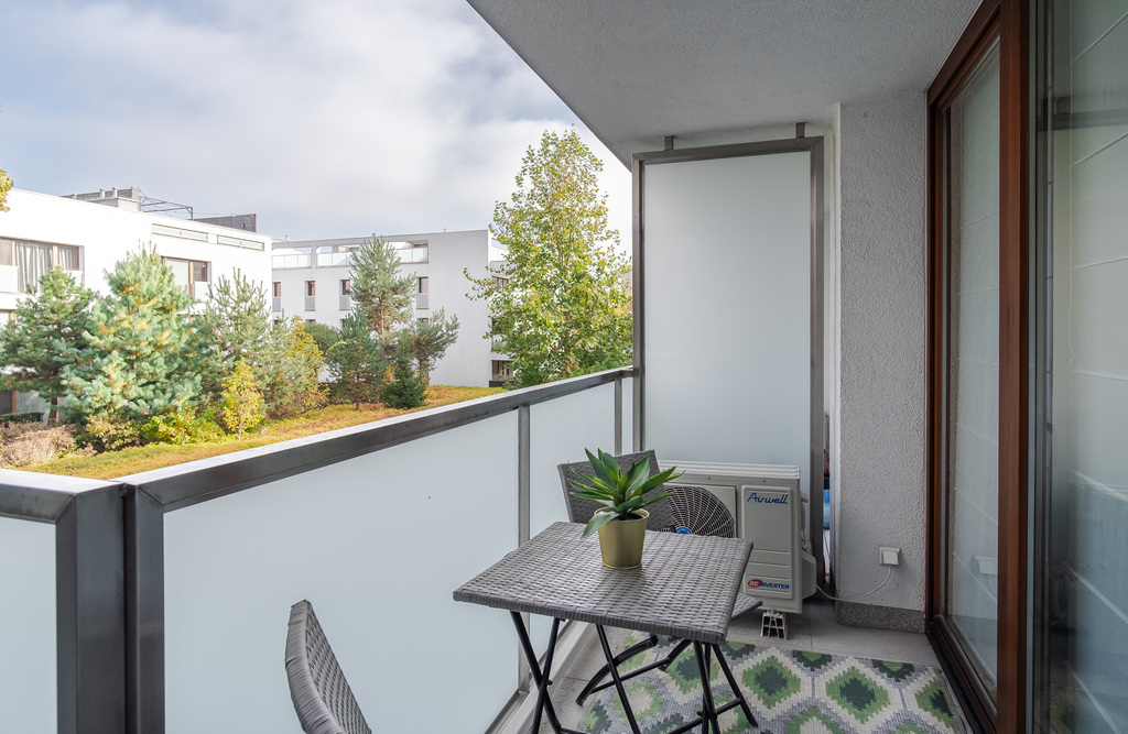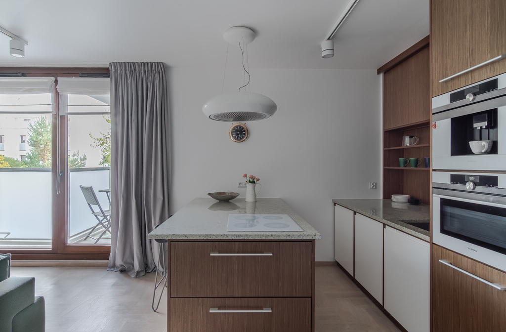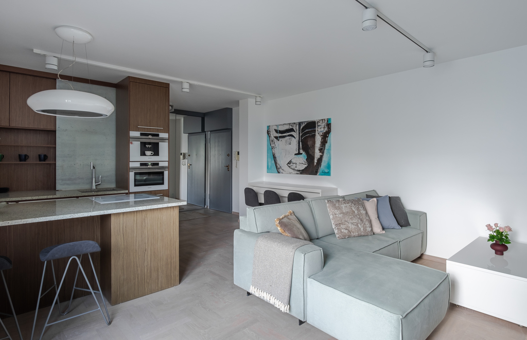 Bezpośrednio z przedpokoju przechodzimy do nowoczesnego aneksu kuchennego. Znajdziemy tam m. in. wysokiej klasy ekspres do kawy w zabudowie, piekarnik, wyspę z płytą indukcyjną, okapem oraz lodówką i zamrażarką. Aneks połączony jest z jasnym, klimatyzowanym salonem, z którego znajduje się wyjście na balkon.
