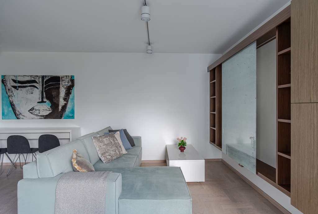 Całe mieszkanie charakteryzuje się minimalizmem i prostotą, która jest typowa dla nowoczesnych wnętrz. Nie ma tu rzeczy niepotrzebnych, a kolorystyka jest stonowana.
