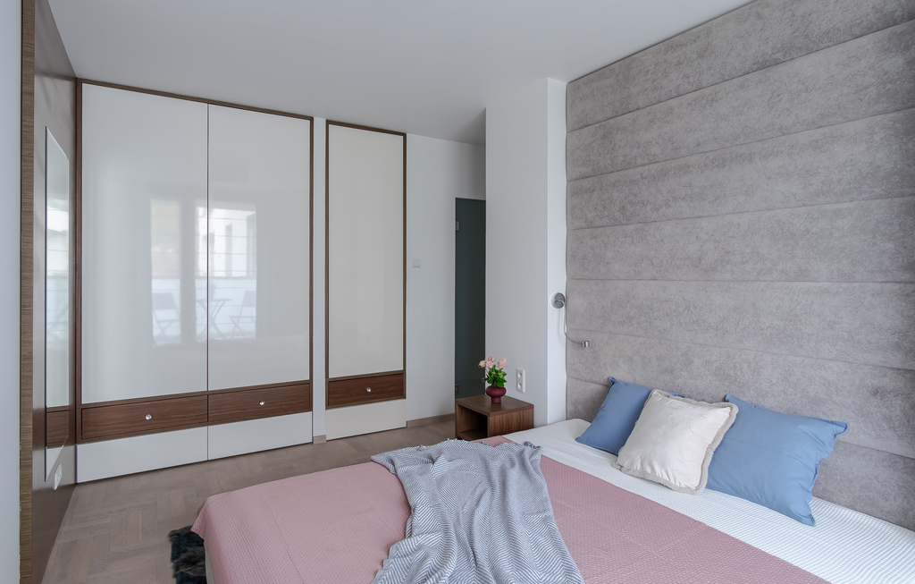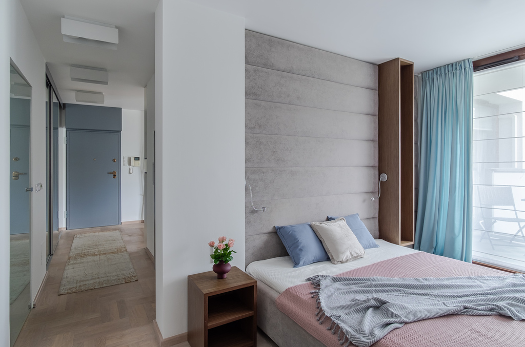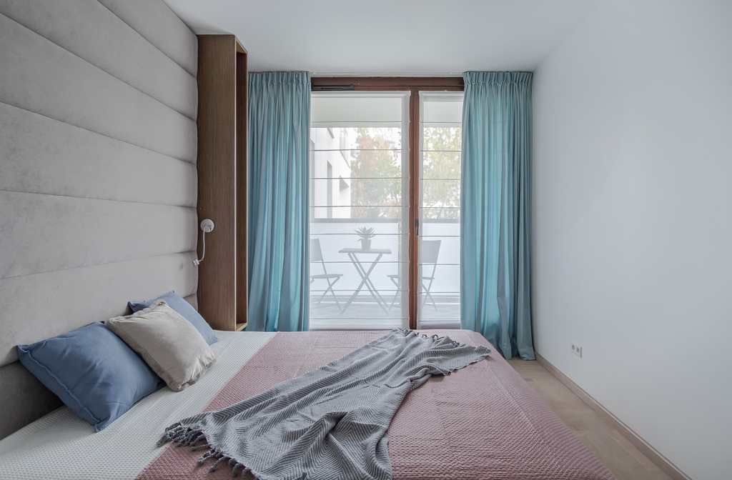 Na ten sam balkon dostaniemy się również przez odrębną sypialnię, która zapewnia prywatność i dobry wypoczynek po ciężkim dniu. Nowy właściciel będzie zaskoczony wygodnym, dużym łóżkiem oraz szafą w zabudowie, która z pewnością pomieści całą garderobę.