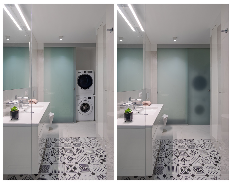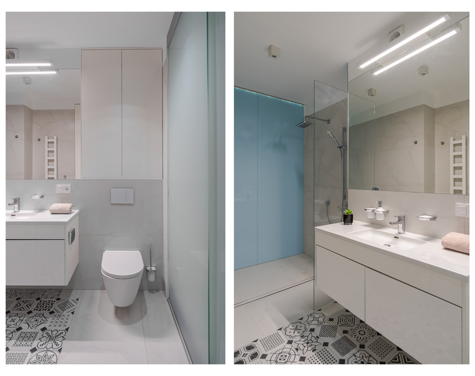 Warto zwrócić uwagę również na przestronną łazienkę, w której znajdziemy dużą kabinę prysznicową, toaletę i umywalkę. Pralka i suszarka na bieliznę ukryte zostały w przesuwanej szafie.
