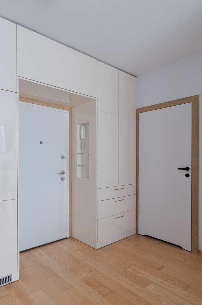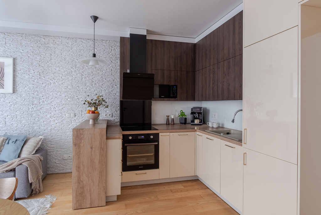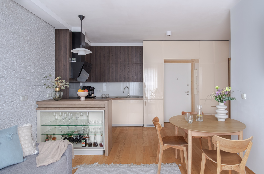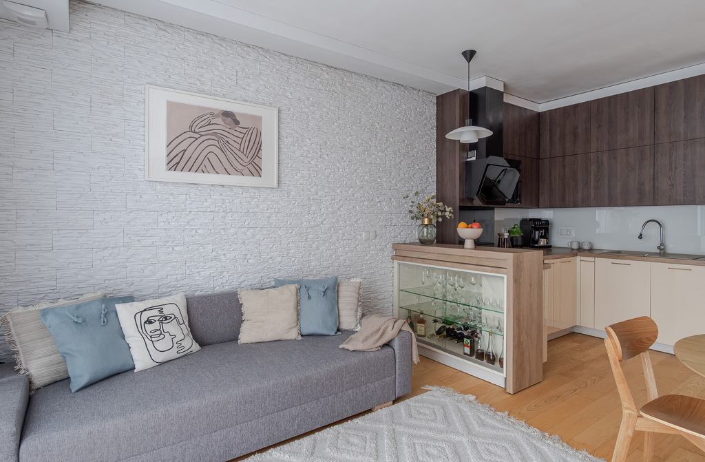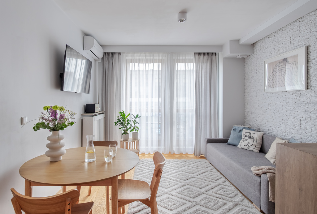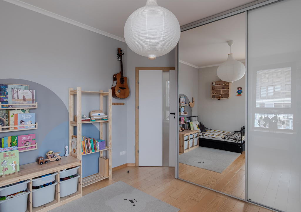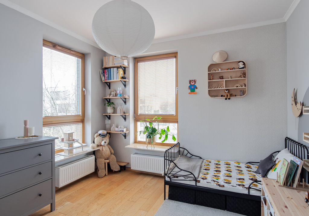 Przekraczając próg mieszkania czuć od razu, że było urządzone z pomysłem i dbałością o szczegóły. Każdy centymetr mieszkania został zaprojektowany z największą starannością o walory estetyczne i funkcjonalne. Do wykończenia zostały użyte materiały wysokiej jakości, a cała zabudowa meblowa została wykonana na zamówienie, dzięki czemu jest bardzo użyteczna. Dużym atutem mieszkania jest piękna, drewniana podłoga, do tego drewniana stolarka okienna- całość tworzy spójną przestrzeń. W salonie została zainstalowana klimatyzacja. Obecnie sypialnia została zaaranżowana na pokój dziecięcy. Zmiany były bardzo dobrze przemyślane i zaprojektowane, dzięki czemu z łatwością można przywrócić to pomieszczenie do funkcji sypialni.