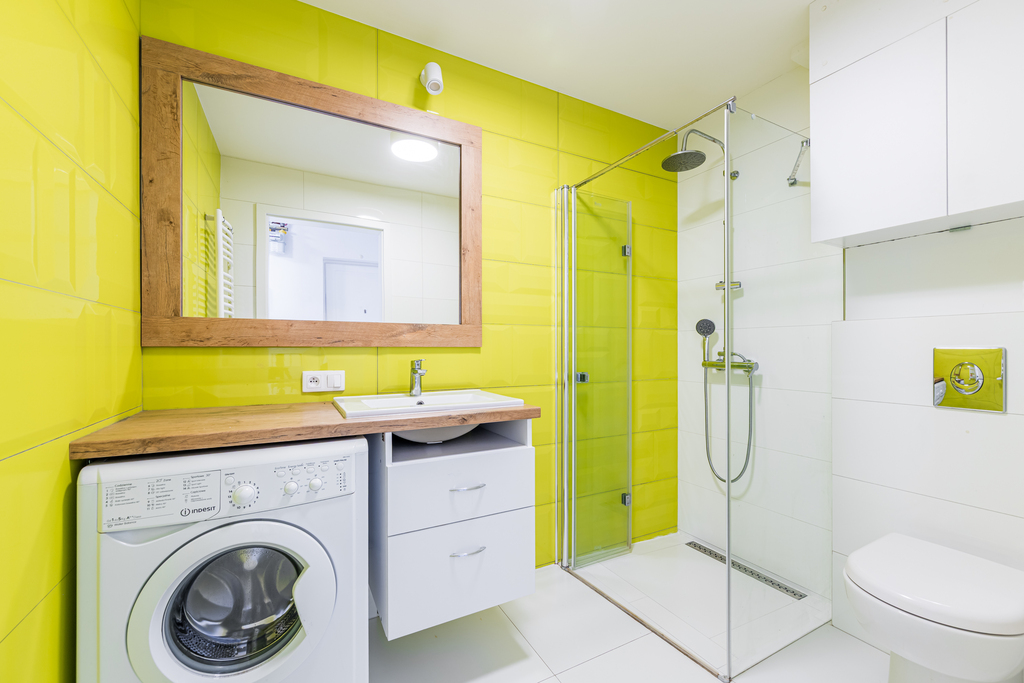 Toaleta to jedyne zamknięte pomieszczenie – została wykończona wysokiej jakości materiałami, wyposażona w bezprogowy prysznic, a jej powierzchnia to ok. 4 m².