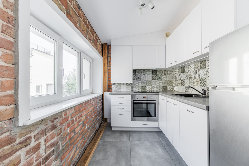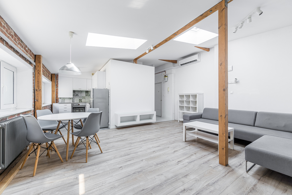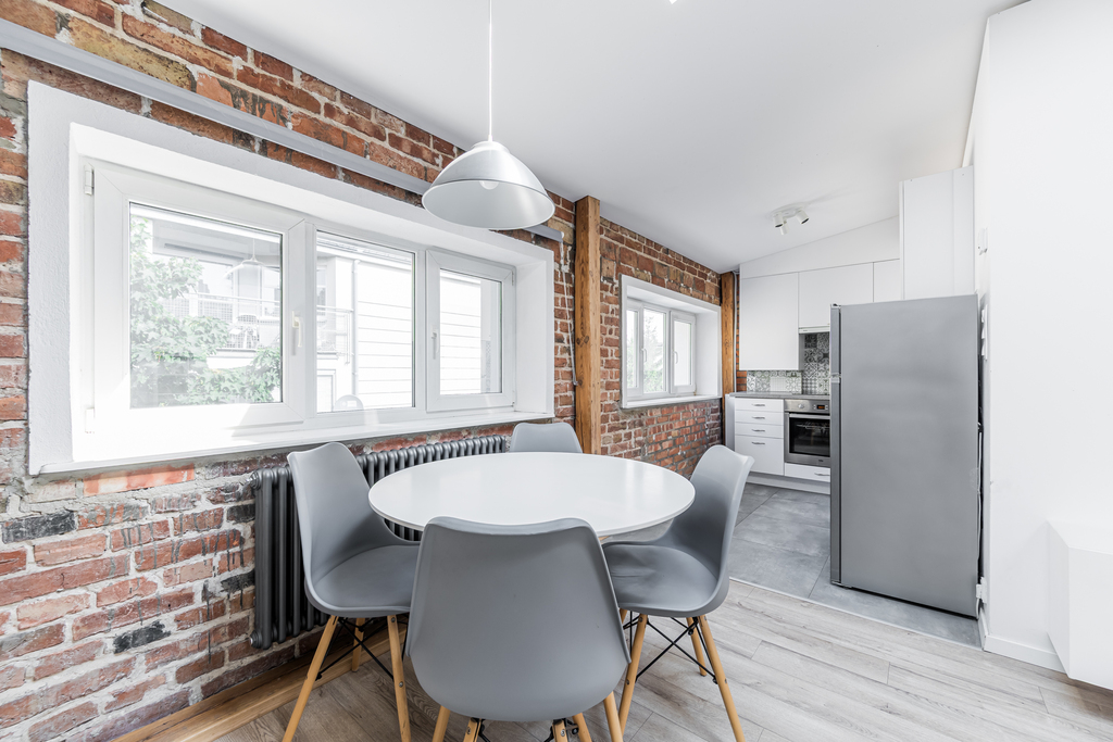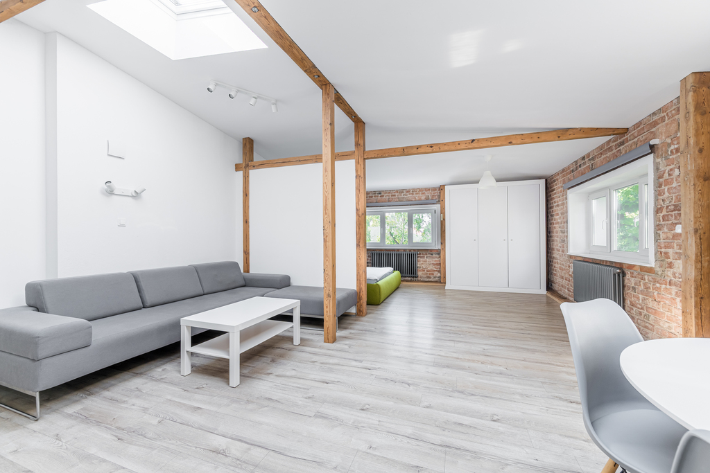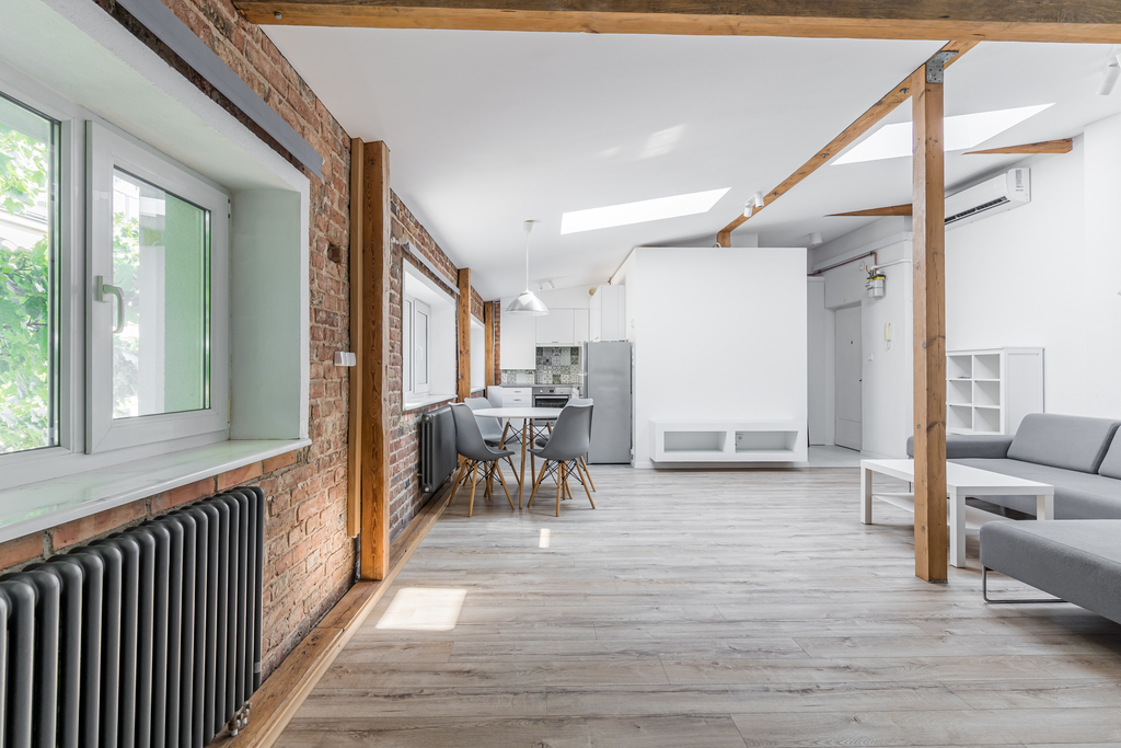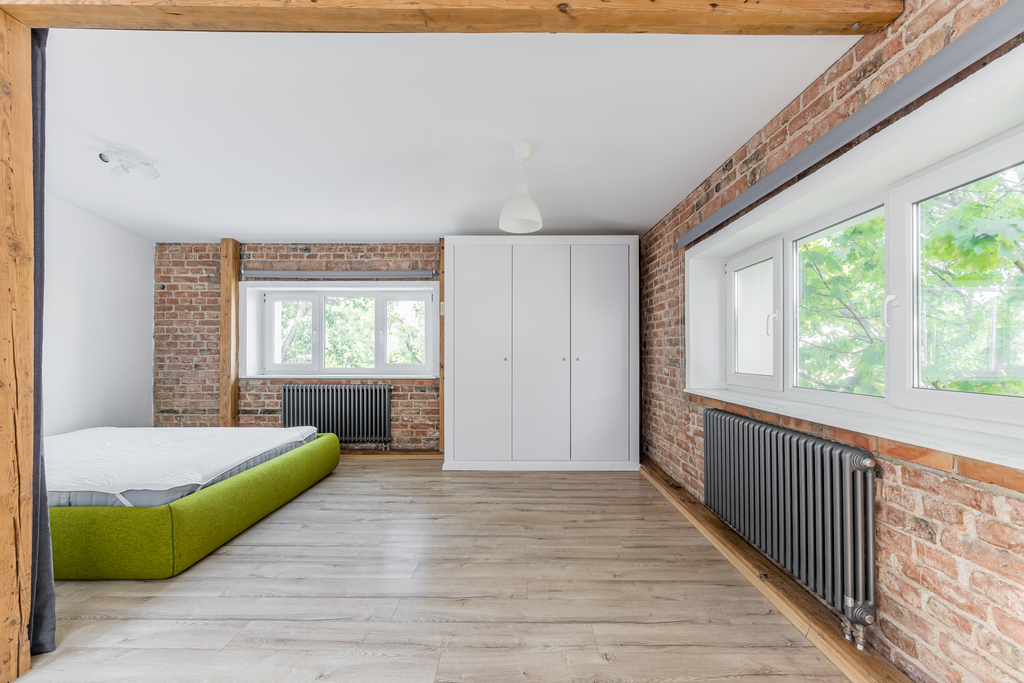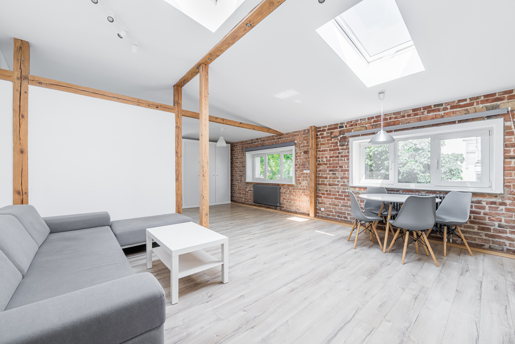 Wysokość, światło i detale! Loftowy charakter wnętrza podkreśla wysokość mieszkania – od 230 cm do ponad 300 cm – oraz duże okna dachowe, które zapewniają znakomite doświetlenie. Odsłonięte, stuletnie cegły i drewniane belki konstrukcyjne dodają wnętrzu autentycznego charakteru.