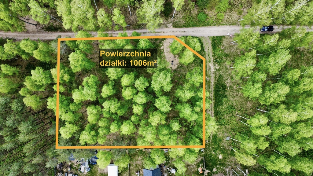 Działka mierzy 1006m² powierzchni, ma kształt trapezu, jest równa i pięknie zalesiona małymi brzozami.