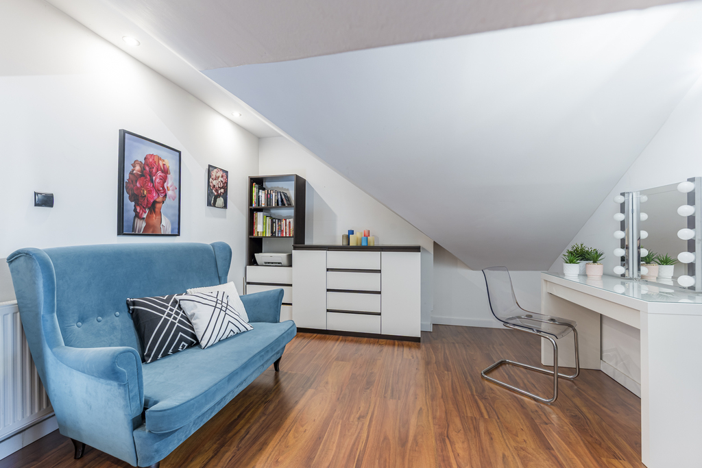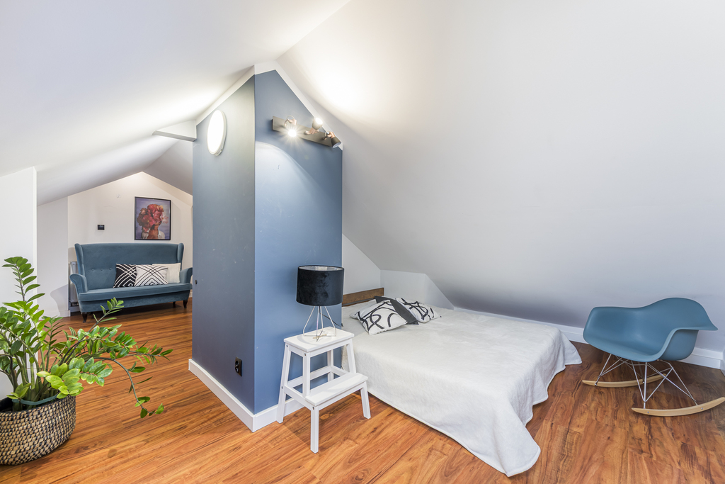 Poddasze (ok. 40 m2) to otwarta przestrzeń z wydzieloną strefą sypialnianą i wypoczynkową- można ją również zaaranżować zgodnie ze swoimi potrzebami np. jako domowe biuro