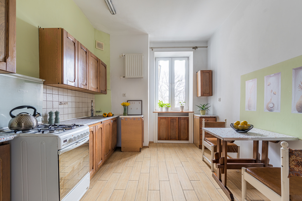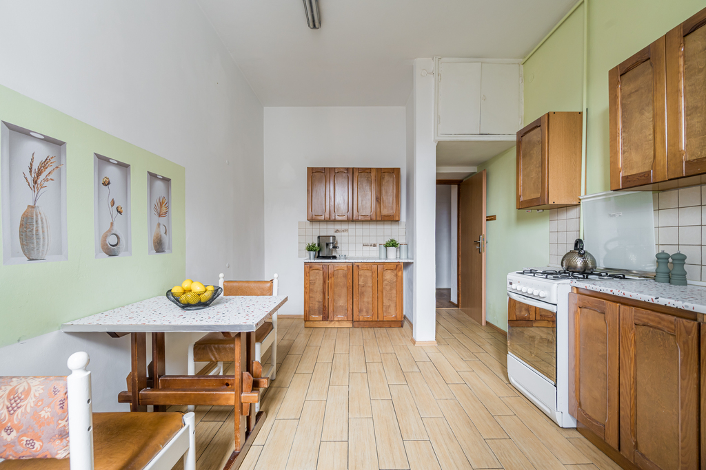 Samo mieszkanie ma ogromny potencjał, jest jasne, zadbane, ale wymaga częściowego remontu. Jest dwustronne - część okien wychodzi na południowy-zachód, na zielone, ciche podwórze, a część skierowana jest na drugą stronę (północny-wchód), którędy przebiega mało uczęszczana droga dojazdowa. Nieruchomość składa się z przestronnego korytarza, osobnej, widnej kuchni, dwóch dużych, ustawnych pokoi, łazienki z wanną oraz osobnej toalety. Ogromnym jej atutem jest to, że posiada balkon oraz piwnicę.
