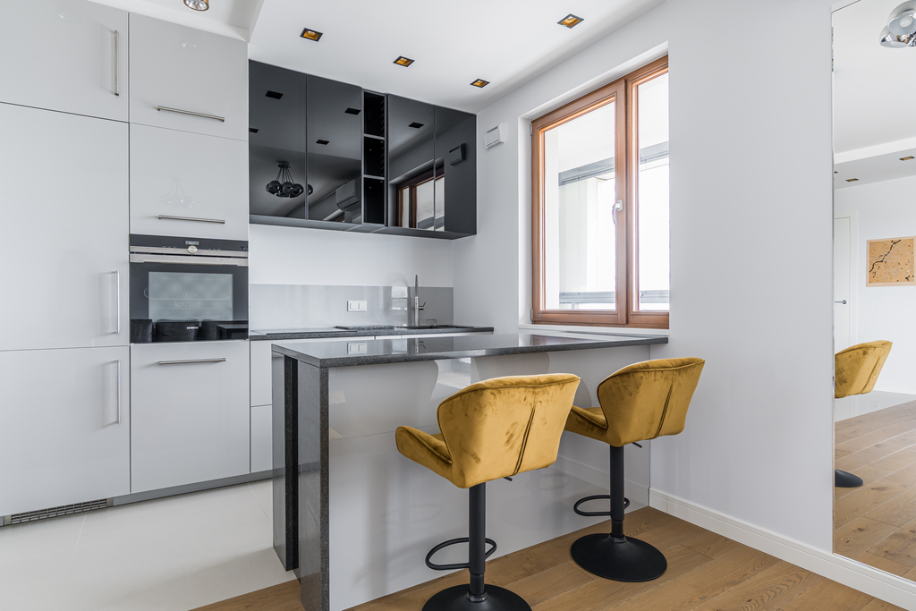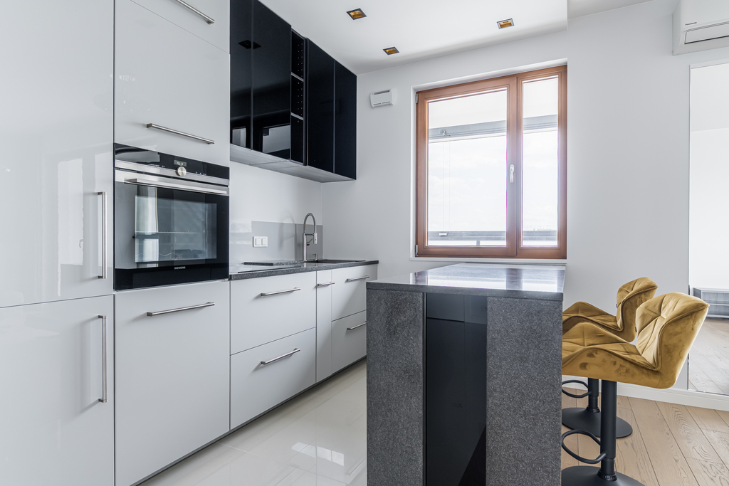 - salon z aneksem kuchennym 29,5 mkw (płyta indukcyjna, zmywarka 60 cm, piekarnik, lodówka, zamrażarka)