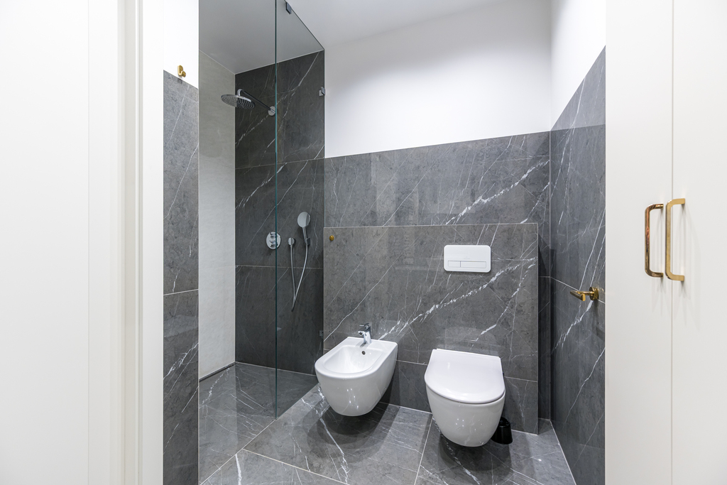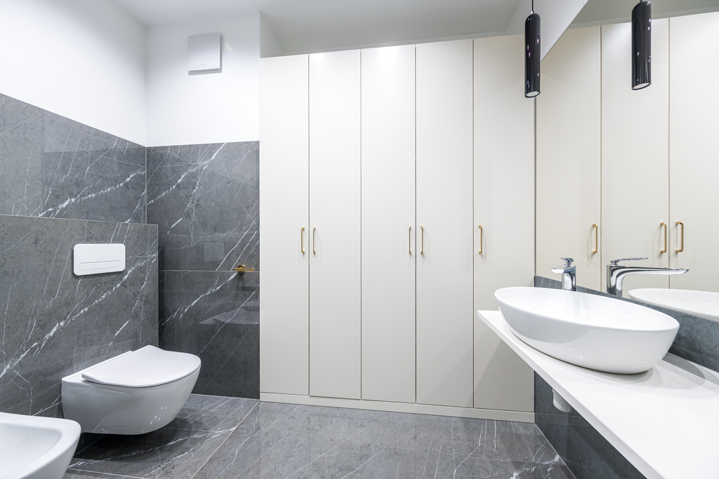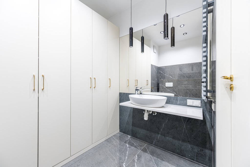 - łazienka z prysznicem oraz bidetem, pralką oraz dużą szafą