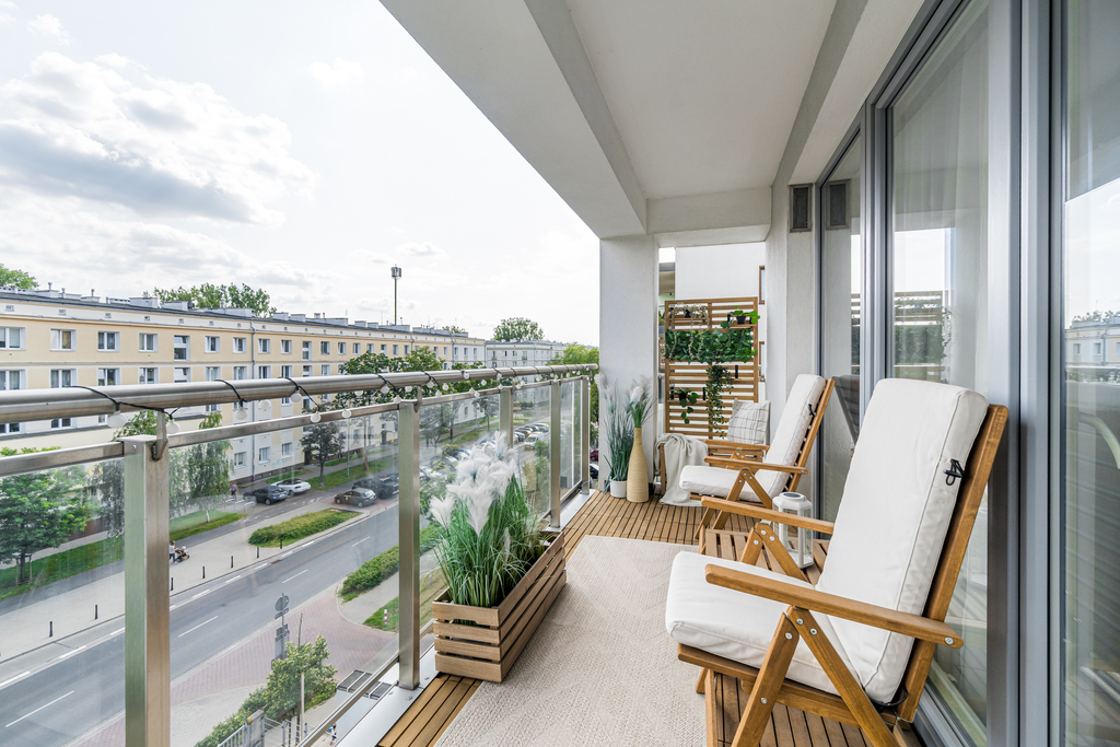 Dużym atutem mieszkania jest urządzona w stylu boho przestronna loggia (6,5 m²), z wyjściem zarówno z salonu, jak i sypialni (12 m²). Mieszkanie jest narożne, co zapewnia prywatność w czasie korzystania z loggii.