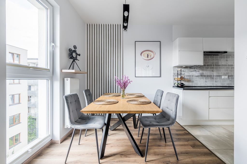 Część dzienna to niemal 31m², na którą składa się salon (26 m²) oraz częściowo oddzielna kuchnia (5 m²). Kuchnia jest wyposażona we wszystkie niezbędne sprzęty, a znajdujący się obok okna stół z 4 krzesłami tworzy funkcjonalną część jadalnianą.