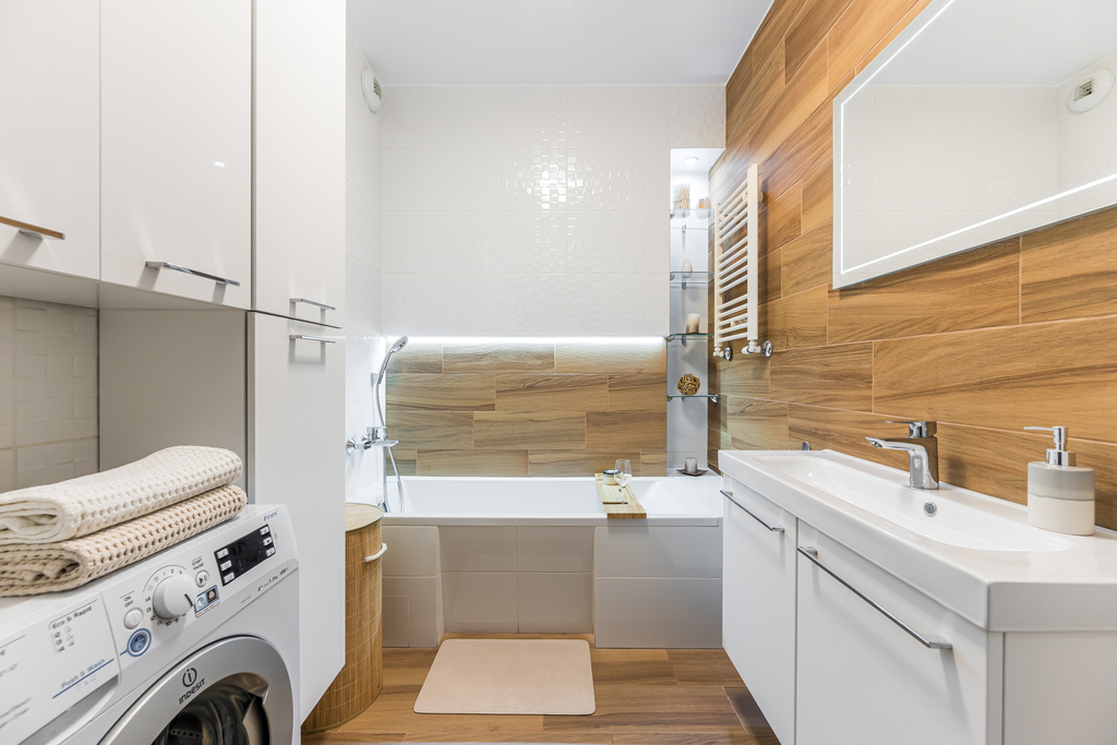 Łazienkę (4,45m²) urządzono w przyjemnym stylu łączącym kolor naturalnego drewna oraz biel. Pomieszczenie wyposażone w wannę z dyskretnym podświetleniem LED, co zapewnia relaksującą atmosferę podczas kąpieli.