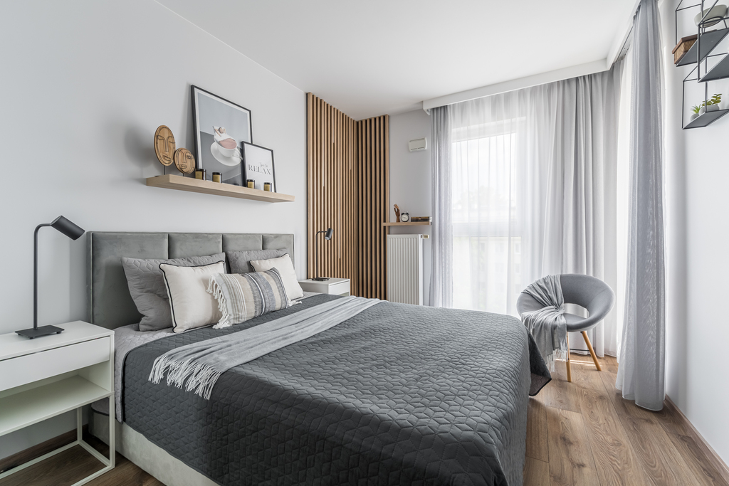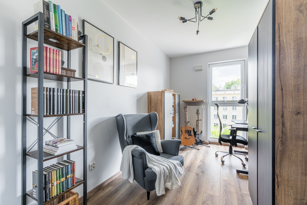 Druga sypialnia (9,83 m²) świetnie sprawdzi się zarówno jako pokój dla dzieci, jak i gabinet do pracy zdalnej.