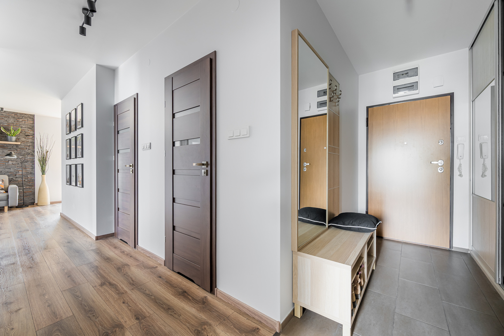 Lokal mierzy blisko 69m². Cała przestrzeń jest zaprojektowana w spójny i przemyślany sposób. Tuż za progiem znajdujemy się w przedpokoju z dużą szafą, z którego mamy dostęp do wszystkich pomieszczeń.