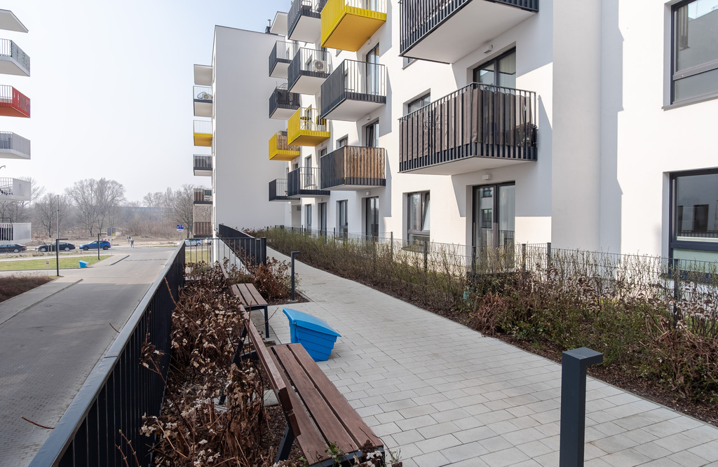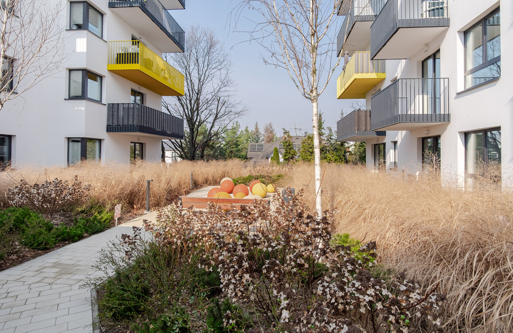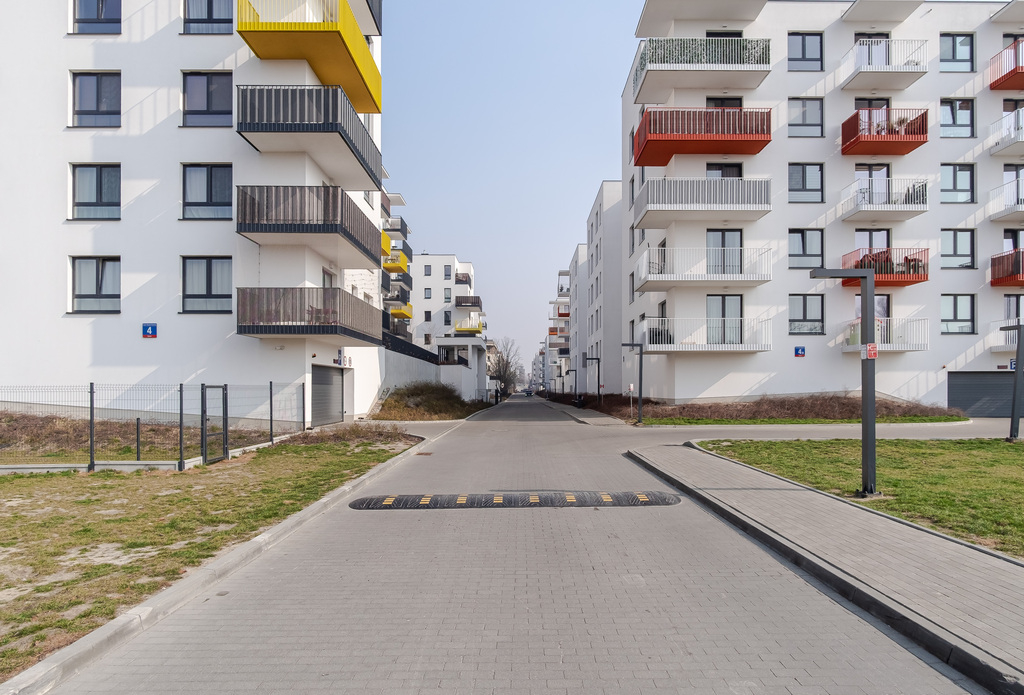 Teren osiedla jest kameralny i bardzo dobrze zorganizowany. Najbliższa okolica jest spokojna, zielona i pełna tras do spacerowania. Lokalizacja jest dużym atutem tej nieruchomości - doskonale łączy spokojne tereny zielone z dobrą komunikacją miejską. Do stacji metra Młociny dojedziemy w mniej niż 15 min.