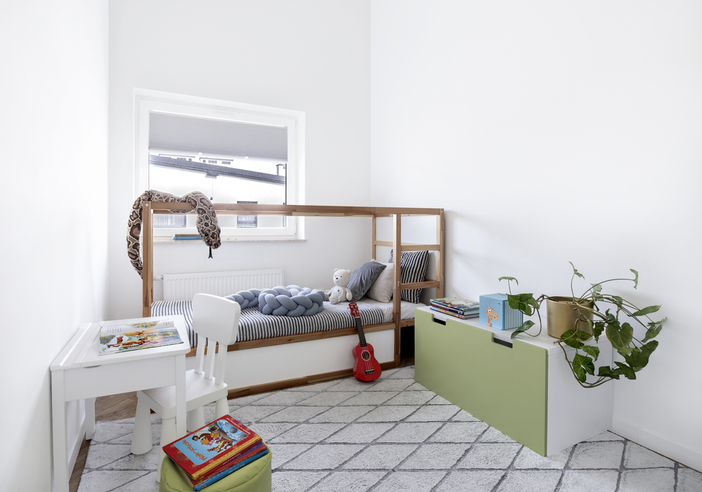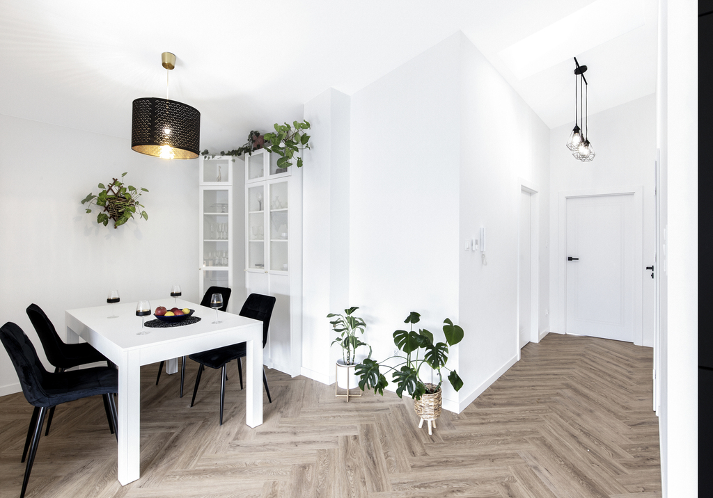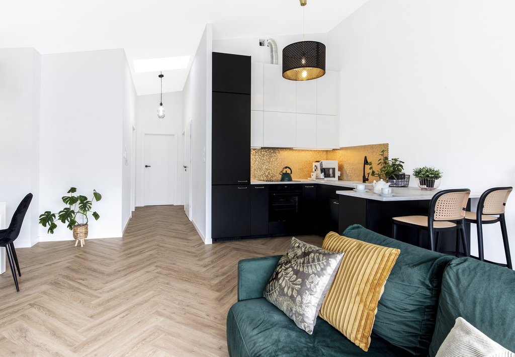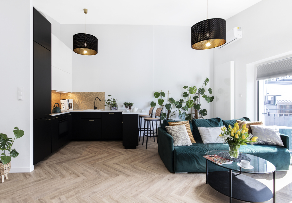 Sercem mieszkania jest przestronny salon połączony z kuchnią – całość ma ponad 30 m². Przemyślane rozplanowanie pozwoliło wygospodarować miejsce zarówno na duży stół jadalniany, jak i wygodną strefę wypoczynkową.