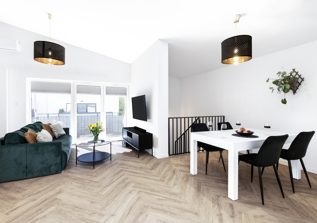 Strefa dzienna została zaprojektowana spójnie i funkcjonalnie.