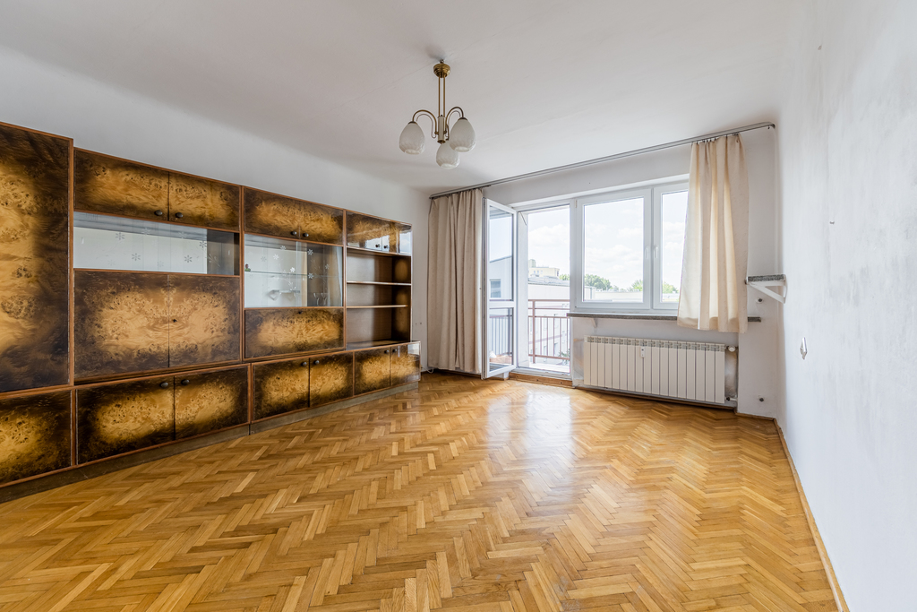 Mieszkanie mierzy 56m², a jego układ jest bardzo przemyślany. Tuż za progiem znajdujemy się w przestronnym przedpokoju, z którego mamy dostęp do wszystkich pomieszczeń. Do dyspozycji nowych właścicieli bedą dwa osobne, duże pokoje mierzące odpowiednio 21m² i 16m². Większy z nich jest wyposażony w balkon - ekspozycja okien w tych pomieszczeniach jest południowa, Na podłodze mamy drewniany parkiet w jodełkę, który po cyklinowaniu odzyska swój dawny blask i będzie służył jeszcze przez wiele lat. Pokoje są bardzo ustawne i wysokie, mierzą bowiem 270 cm, co pozytywnie wpływa na poczucie przestrzeni.