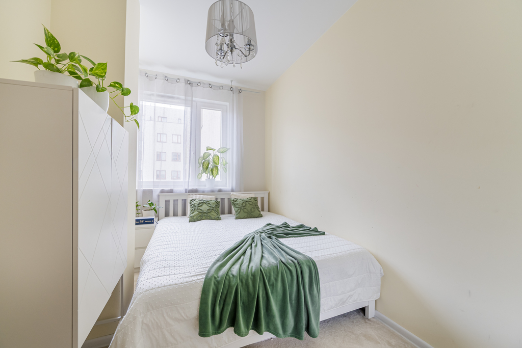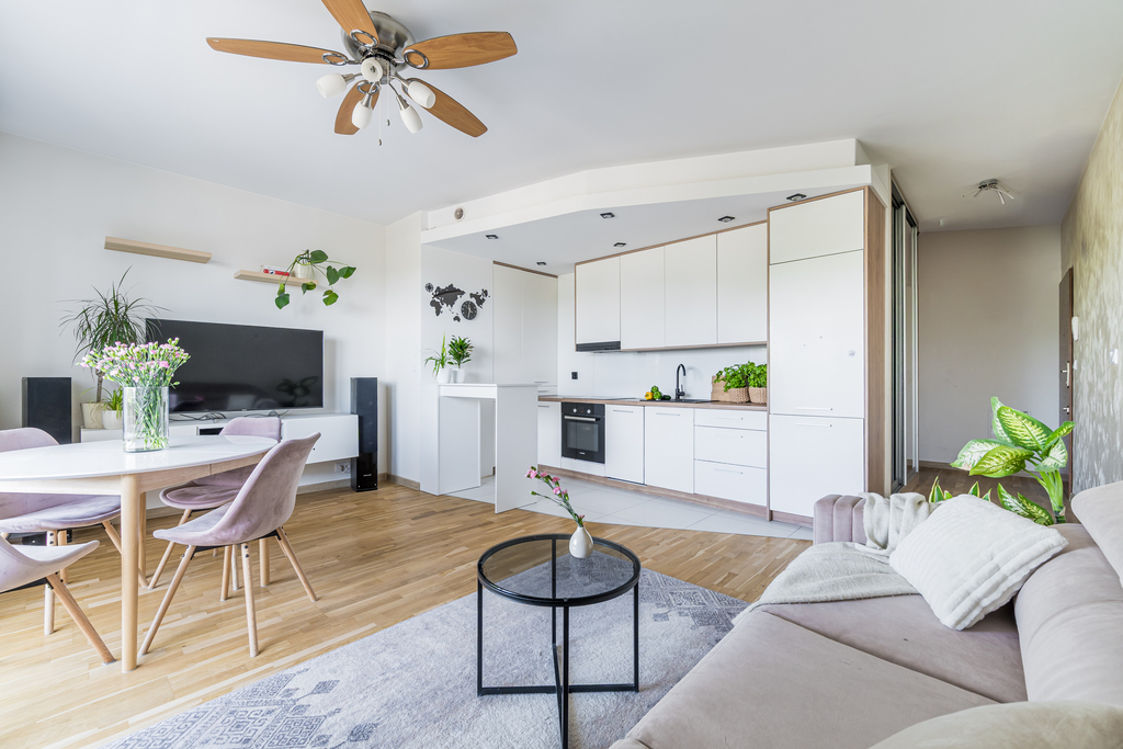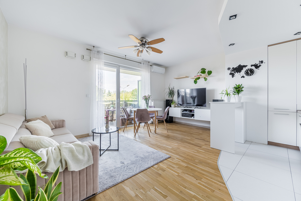 Lokal mierzy 60 m² i ma bardzo funkcjonalny układ. Wyraźnie podzielony jest na główną część dzienną, gdzie znajduje się salon z aneksem kuchennym o powierzchni ok. 24 m² – z którego mamy wyjście na przestronny balkon (ok. 7 m²). Kuchnia jest w pełni wyposażona w niezbędne sprzęty.