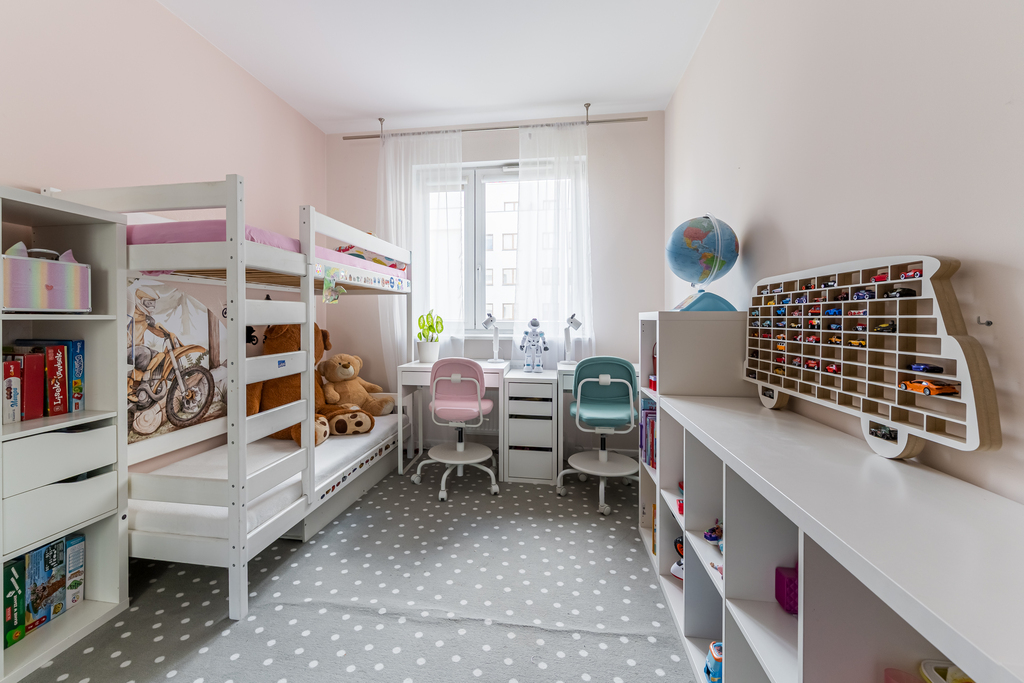 W drugiej części mieszkania znajdują się: łazienka (ok. 5 m²), toaleta oraz dwa pokoje mierzące odpowiednio 11,3 m² i 8,7 m². Obecnie pełnią funkcję sypialni oraz pokoju dziecięcego.