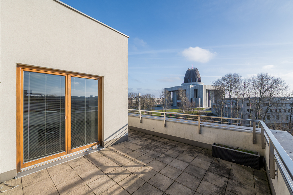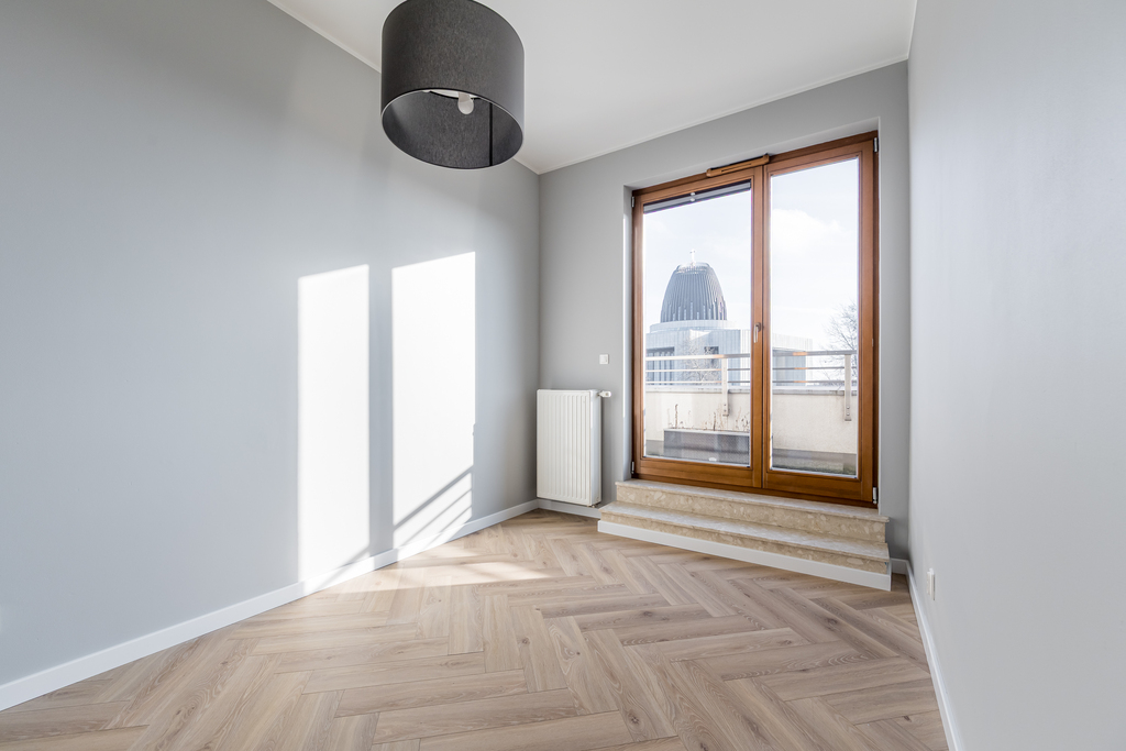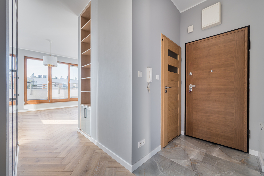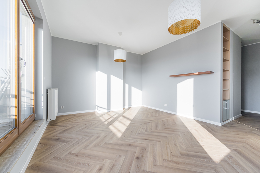 Do wynajęcia świeżo po remoncie, jasny penthouse 75 m² z garderobą, dużym tarasem i własnym miejscem w garażu podziemnym.